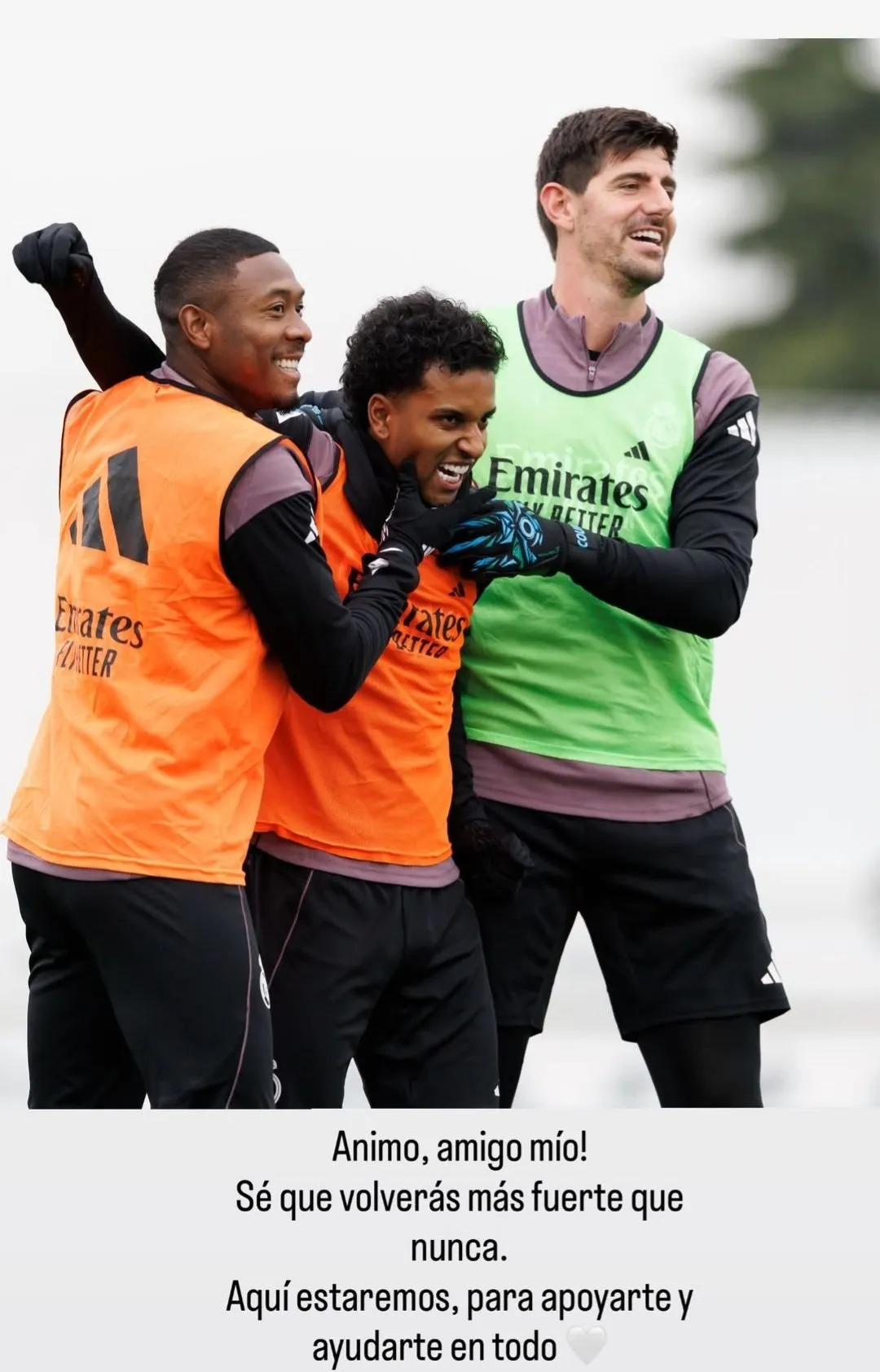 皇马门将库尔图瓦也发文安慰了罗德里戈。他写到:“加油,我的朋友!我知道你会比以往任何时候都更加强大地回归。我们会一直在这里支持你,帮助你解决一切问题。”